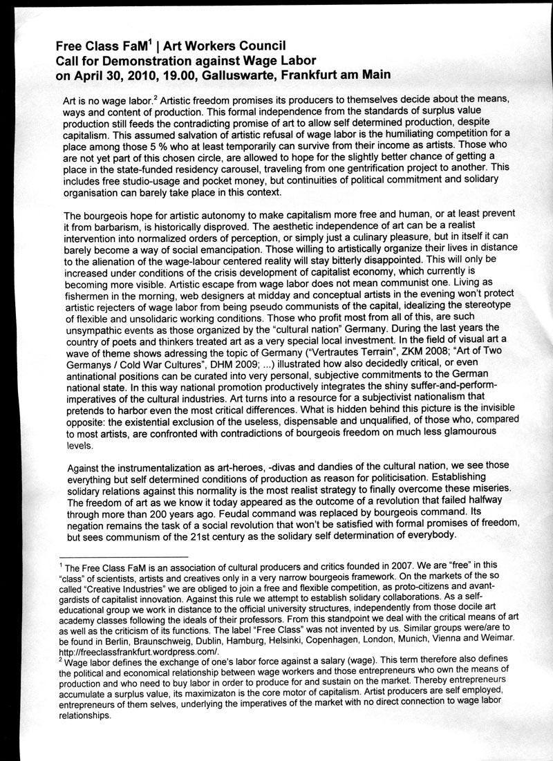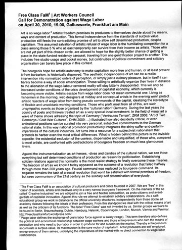 The Art Workers Council Frankfurt/M. (AWC) spoke with the anarcho-syndicalist trade union Freie Arbeiterinnen und Arbeiter-Union (FAU, Free Workers Union) Frankfurt/M. about the crisis, the so-called 'German Model', working conditions and organizing in the cultural sector, and about the mobilization for the European day of action M31 on March 31, 2012.